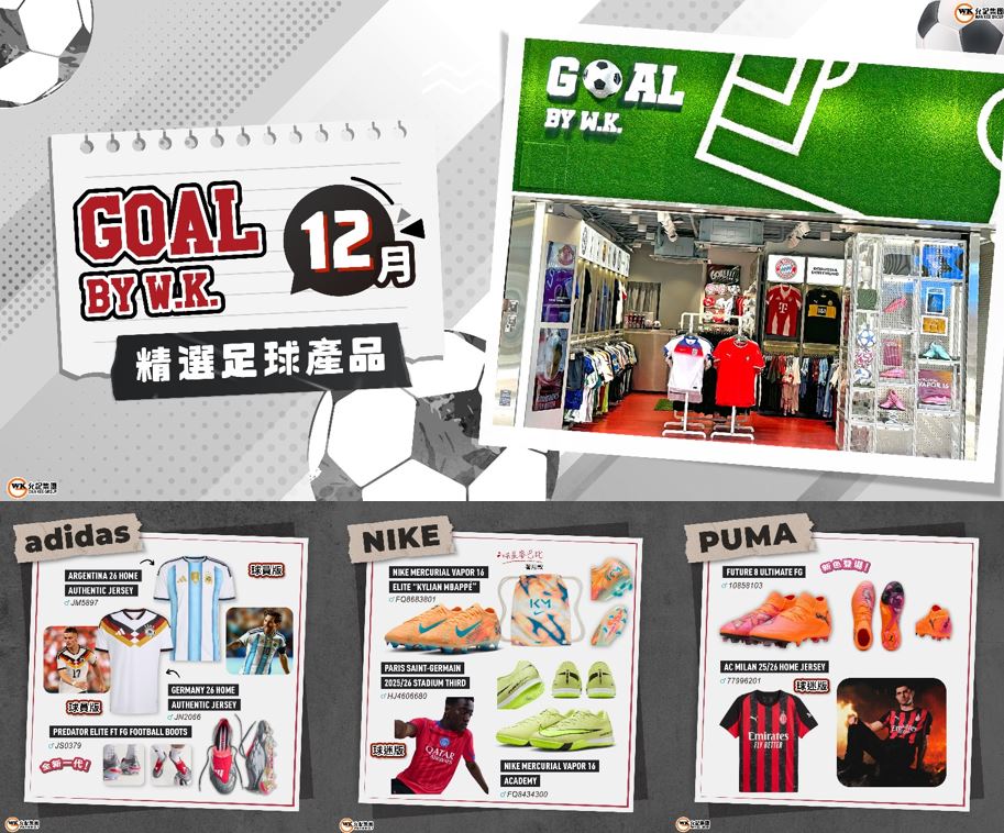 【GOAL BY W.K. – 12月精選足球產品】 聖誕月都要Keep住你足球團火 12月繼續有一系列精選足球產品等緊你,即刻嚟 GOAL BY W.K. 選購啦 *分店內有更多款式,詳情請向分店職員查詢 *部份球衣提供燙印服務,詳情請向分店職員查詢 *價格以店舖為準 GOAL BY W.K. 地址 旺角奶路臣街12-26號舖地下 2382 0382
