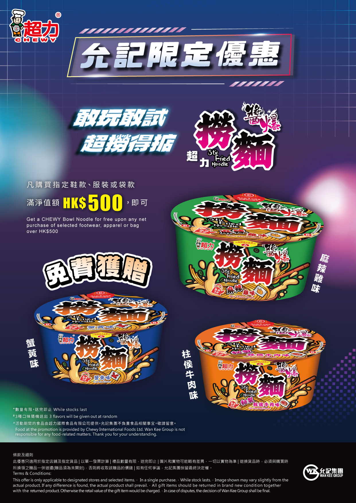 由即日起,只要到指定允記分店消費購買指定鞋款、服裝或袋款滿淨值額HK$500,即送你超力醬爆撈麵一個