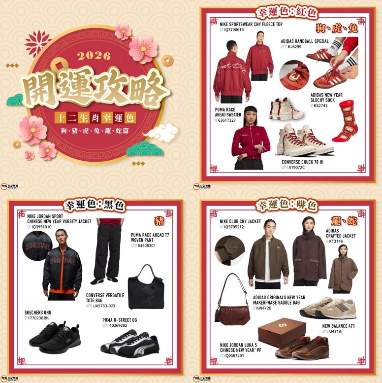 【開運攻略!2026十二生肖幸運色 (下)】 繼續返嚟揭曉馬年十二生肖幸運顏色 今期輪到生肖狗、豬、虎、兔、龍、蛇嘅時間 買衫最緊要買得啱,揀啱服飾、鞋款等於幫自己提升運勢,好運「馬」上來! *內容只供參考 *所有款式於允記各分店有售 *各分店有更多款式,詳情請向分店職員查詢 *價格以店舖為準 允記各分店: https://bit.ly/2SMwm3r