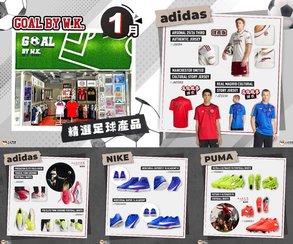 【GOAL BY W.K. – 1月精選足球產品 】 又返嚟足球狂熱啦 1月繼續有一系列精選足球產品等緊你,即刻嚟 GOAL BY W.K. 選購啦 *分店內有更多款式,詳情請向分店職員查詢 *部份球衣提供燙印服務,詳情請向分店職員查詢 *價格以店舖為準 GOAL BY W.K. 地址 旺角奶路臣街12-26號舖地下 2382 0382