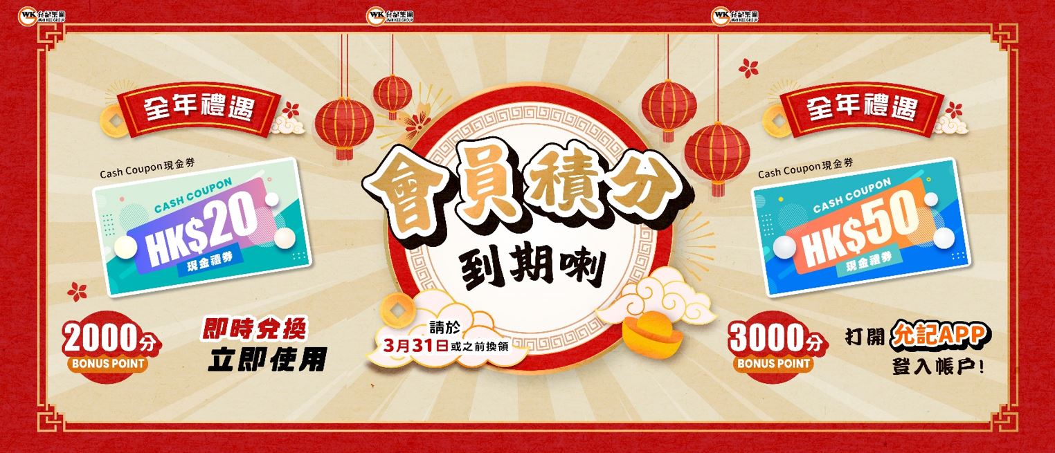 【會員積分到期啦】 召集!各位允記尊貴會員請注意 會員積分將於今年月號到期啦 仲有積分未用?即刻打開允記APP換走以下現金禮券啦 HK$20 現金禮券:滿2000積分即可免費兌換 HK$50 現金禮券:滿3000積分即可免費兌換 過年前shopping 記得用埋積分換coupon,嚟指定分店即換即用,著數攞到盡 *此優惠只適用於指定分店 *各分店款式或有不同,一切以店內款式為準 *禮品數量有限,換完即止 更多會員積分詳情:https://bit.ly/2Wo9tpQ
