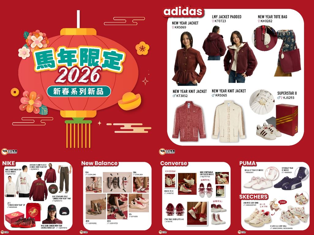 【馬年限定!2026 新春系列新品】 馬年限定新春系列大集合! 為慶祝農曆新年,各大品牌以馬年為設計靈感,隆重推出咗一系列馬年限定服飾及鞋款 除咗換上新春紅色調,新品同時加入不同馬年專屬元素,打造充滿活力與喜慶嘅時尚景象 新年新氣象,快啲嚟各門市選購適合你嘅新春系列款式,著新衫、新鞋喜迎馬年啦 *各分店有更多款式,詳情請向分店職員查詢 *價格以店舖為準 允記各分店: https://bit.ly/2SMwm3r